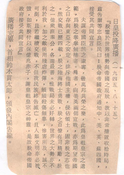 1945年8月15日日本天皇投降廣播詞。這篇文告是告訴自己的老百姓(忠良臣民)的。其中對(duì)于發(fā)動(dòng)戰(zhàn)爭(zhēng)的罪責(zé)不但沒(méi)有一個(gè)字的自責(zé),而且指“敵使用殘虐炸彈,頻頻殺傷無(wú)辜,慘害所及,誠(chéng)不可測(cè)!焙褪嗄旰笏l(fā)現(xiàn)的東條英機(jī)遺囑的惡劣態(tài)度如出一轍。廣大網(wǎng)友不放回頭看看2013年12月12日18:21:31《歷史鐵證日本400年侵華野心,讓我們恨搗靖國(guó)神社內(nèi)幕吧!》一文中東條英機(jī)的遺囑。