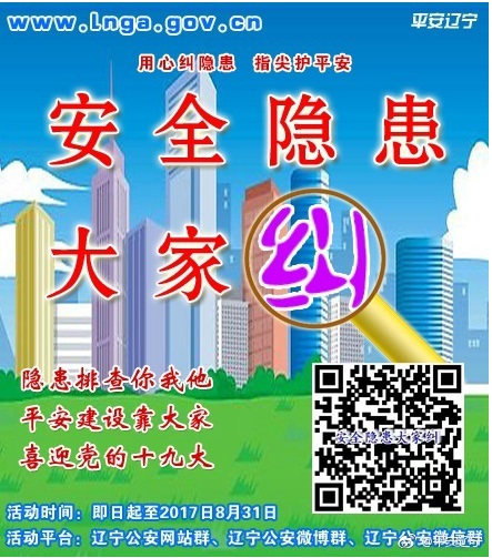 為深入貫徹落實習近平總書記系列重要講話精神,充分發(fā)揮全省“網上公安機關”平臺作用,遼寧省公安廳從即日起至8月31日,組織全省公安機關依托各級公安政務網站、公安政務微博、公安政務微信平臺,集中開展“安全隱患大家糾”活動,全面開啟遼寧公安“查患治患”工作的“互聯(lián)網+”模式。