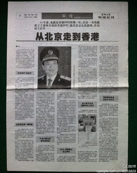 1997年對(duì)中國(guó)人來(lái)說(shuō),是難忘的一年。香港終于結(jié)束了英國(guó)殖民地身份,回歸祖國(guó)懷抱。為迎接這一歷史性時(shí)刻,1997年3月10日下午3點(diǎn),安徽蕪湖鐵路職工、涇縣人王鑫海背起一個(gè)大大的行囊獨(dú)自從北京西站出發(fā),踏上徒步京九線、迎接香港回歸的漫漫征程。