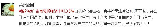 針對(duì)此次“凱迪仕智能鎖”“拆彈磚家”廣告事件,有網(wǎng)友認(rèn)為平臺(tái)應(yīng)該承擔(dān)相應(yīng)責(zé)任。