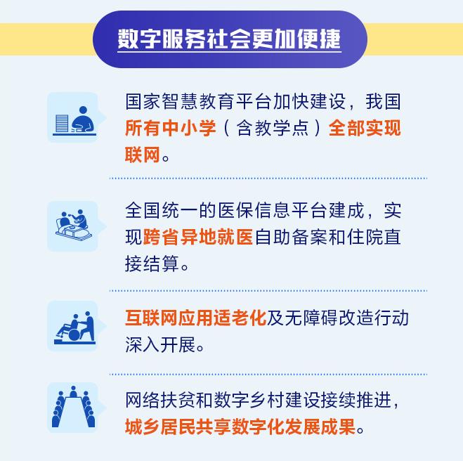 與此同時(shí),《報(bào)告》介紹,在數(shù)字服務(wù)社會(huì)方面,國(guó)家智慧教育平臺(tái)加快建設(shè),我國(guó)所有中小學(xué)(含教學(xué)點(diǎn))全部實(shí)現(xiàn)聯(lián)網(wǎng)。全國(guó)統(tǒng)一的醫(yī)保信息平臺(tái)建成,實(shí)現(xiàn)跨省異地就醫(yī)自助備案和住院直接結(jié)算。互聯(lián)網(wǎng)應(yīng)用適老化及無(wú)障礙改造行動(dòng)深入開(kāi)展。網(wǎng)絡(luò)扶貧和數(shù)字鄉(xiāng)村建設(shè)接續(xù)推進(jìn),城鄉(xiāng)居民共享數(shù)字化發(fā)展成果。